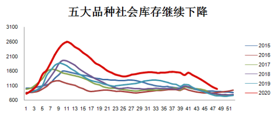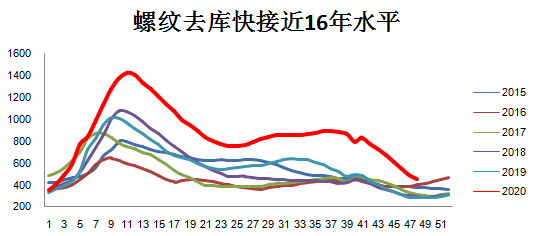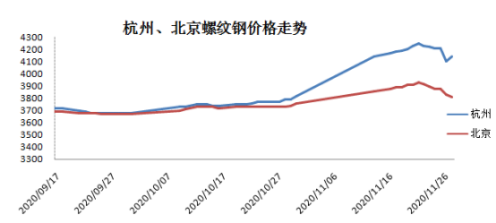 如果说上半年是疫情因素,政策放水推动钢材强势,3季度以后则是需求回归,加上4季度工业领域制造业强势恢复,助涨了钢市的大幅上涨。在2020年剩下的一个多月时间里,会逐步剔除市场热炒因素,各种预期,真刀真枪的看供需如何来演变。经济上仍然是强劲恢复的,尽管欧美国际疫情严重,但中国年度经济,板上钉钉是要回升的。表现在工业领域制造业强劲恢复,消费需求持续上涨。有色金属、原油近期大幅上涨,行情开始启动。这个大周期也是制造业强势回归的开始,目前汽车、家电、工程机械、装备制造这些行业都保持较好的复苏增长势头,有色金属原材料价格已经回到疫情水平之上。这是有底气的。很多人会问钢材不是也创新高了吗,会像有色一样继续看好吗?这个情况不一样,钢市是逆周期的,已经上涨了大半年了,该消停消停了。但后边即便没有太大上涨空间,回落的空间也不是很大。为什么?经济托底,大宗商品旺盛的格局衬托,不会发生大跌,暴跌行情。本轮上涨与6-7月上涨有显著不同,上一次是成本驱动为主,这轮主要是需求驱动为主。需求驱动表现在几个方面。一是雨季需求延迟的需求;二是赶工需求以及制造业等下游行业强劲增长;三是价格上涨激发的增量需求。当然,产业链上游成本依然在高位,焦炭实现了7轮上涨,吨焦利润已经超过吨钢,而且铁矿石重回130美元上方,重回高位。这使得钢厂拉涨成材意愿更加迫切和强烈。也正基于此,钢铁现货市场表现比期钢更为强烈,一度促使基差扩大。问题是,11月已经进入下旬,现货市场已经出现一定滞涨现象,接下来市场也会面对天气转冷,需求、冬储、主力合约换月等诸多问题,后面的矛盾也比较大。供需的直观表现仍然是库存。现在的去库节奏放缓,从11月以来加速下降,从单周80万到150万,再回到90万。但是目前库存降速确实放缓了。目前的库存是什么状态,螺纹钢提去年同期还高近200万吨的水平,只有线材少数品种回到了去年水平。整个五大钢材品种库存仍比去年同期高出27%左右,有的机构统计是25%或者30%,不过都说明,库存还是高。高就得消化,消化又面临两个问题,一个是冬储问题,一个是降价去库存还是涨价去库存。没有好的预期,如何冬储?11月份剩下时间已经不多,低温、雨雪天气增加,需求由北至南难免减弱。降库速度放缓是大概率的事。乐观预计,12月中旬进入累库阶段,或者比去年稍晚一周,今年不例外。从去库的幅度来看,华东、西南、华南进入11月份是降库最快的,也说明北方天气影响需求降库不及预期。目前北方多地夜间远离0度以下,夜间施工赶工的现象也减少了,从北到南,需求递减的过程随着时间会慢慢拉开。