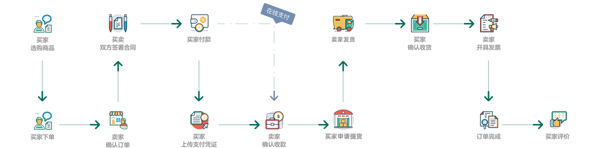 买卖双方交易需求达成一致后,买家下单,卖家确认订单后买家可支付全款,或与卖家协商一致支付首付款,卖家收款后发货。